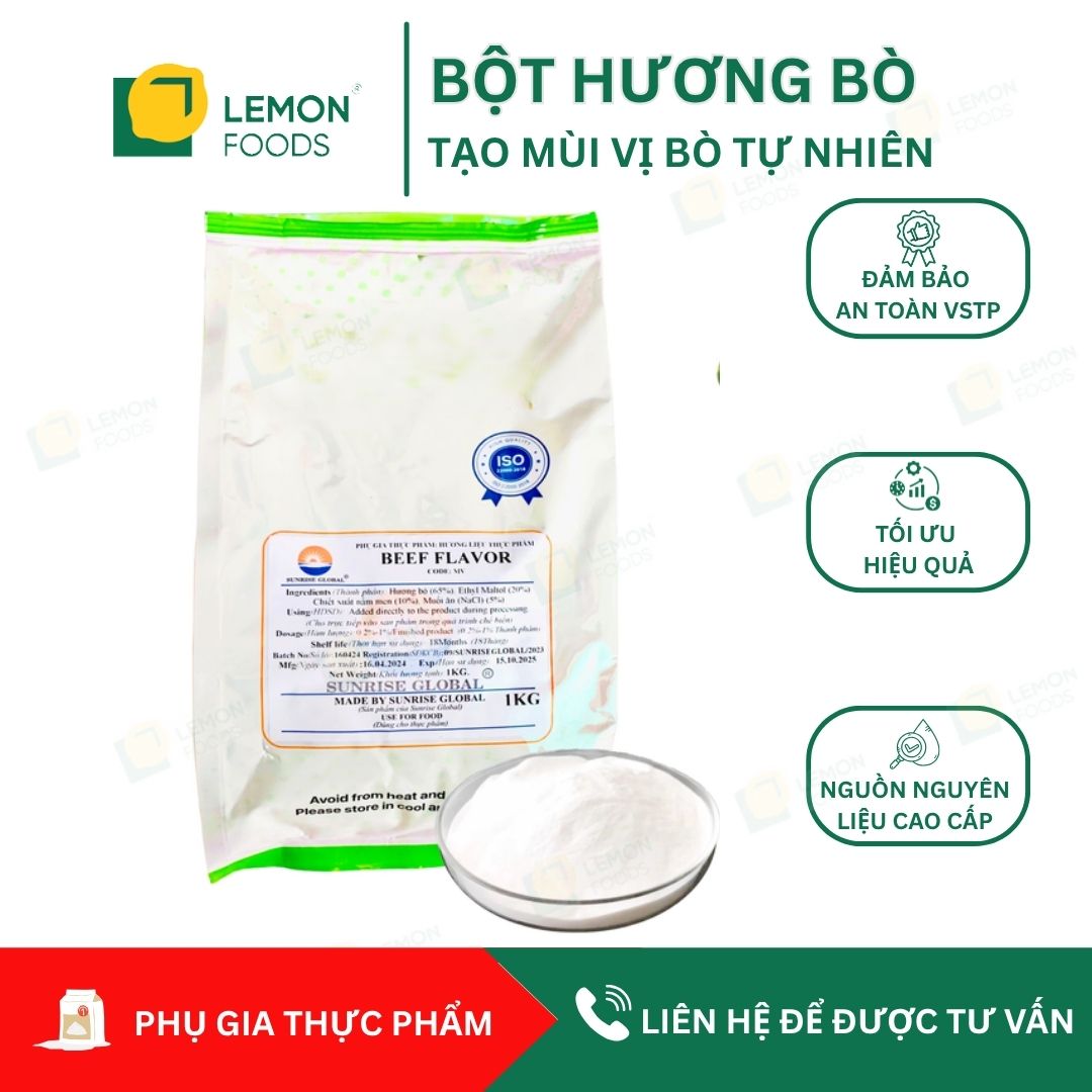 Bột hương bò (Beef Flavor) là giải pháp giúp tăng hương vị thịt bò tự nhiên, đậm đà cho các món ăn như xúc xích, lạp xưởng, chả bò, bò viên… Sản phẩm được Bộ Y Tế cấp phép sử dụng đảm bảo an toàn cho sức khỏe, phù hợp cho cả cơ sở sản xuất thực phẩm lẫn người tiêu dùng chế biến tại nhà, giúp tối ưu chi phí hiệu quả.