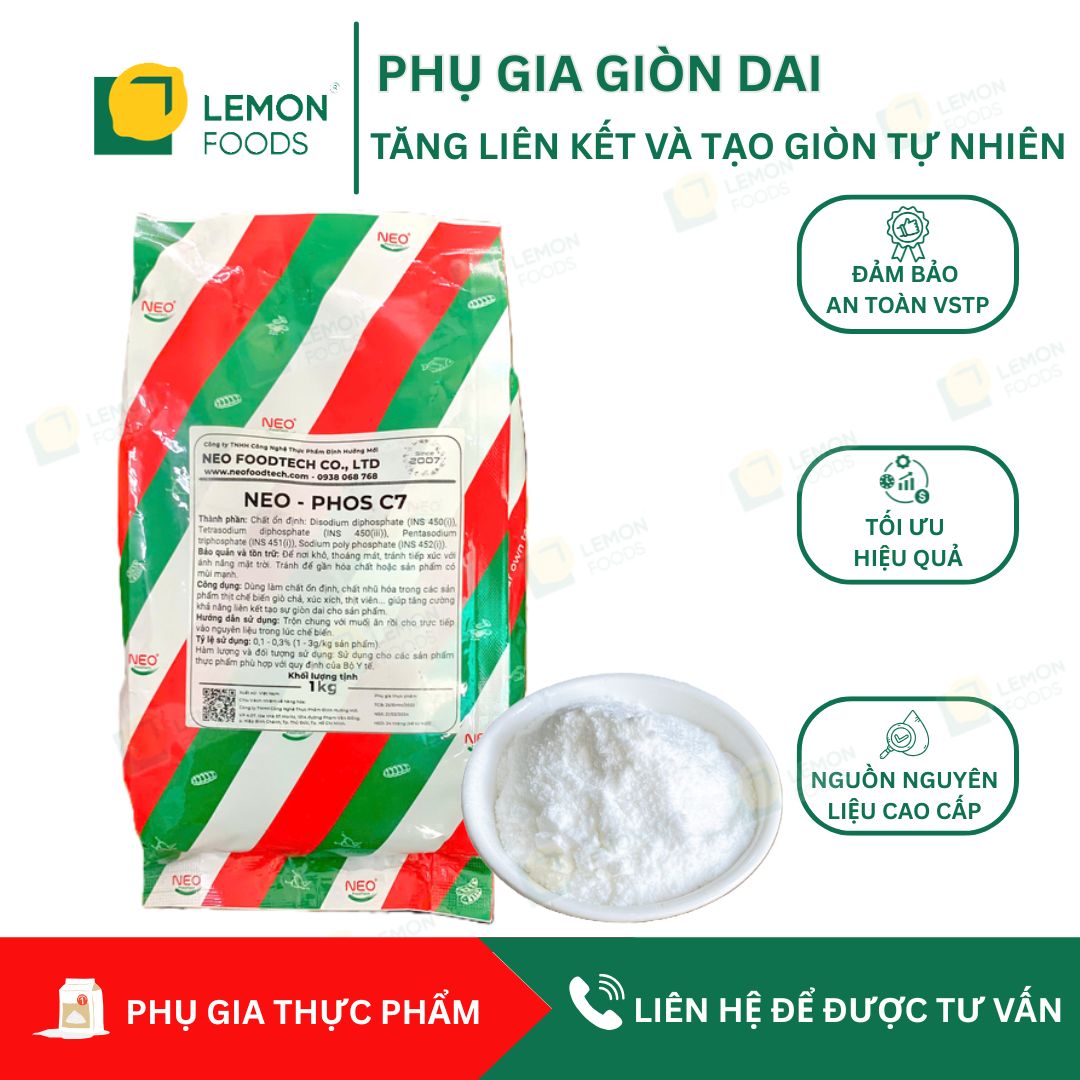 Chất tạo giòn Neo Phos C7 là phụ gia thực phẩm dạng bột có thành phần chính là các nhóm Di–Tri Phosphate – hợp chất có khả năng liên kết protein, giúp giữ nước và tăng độ đàn hồi tự nhiên cho thịt.